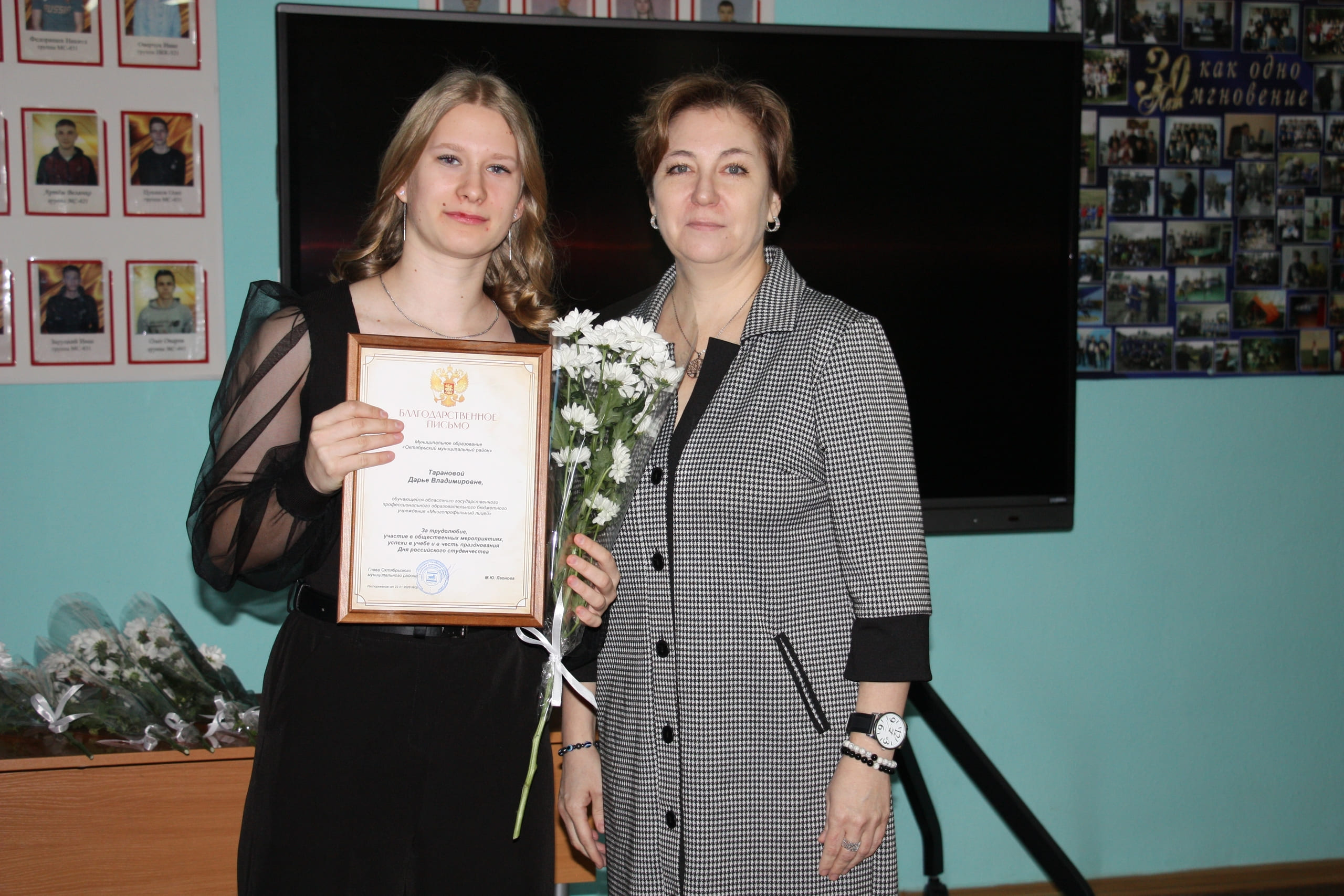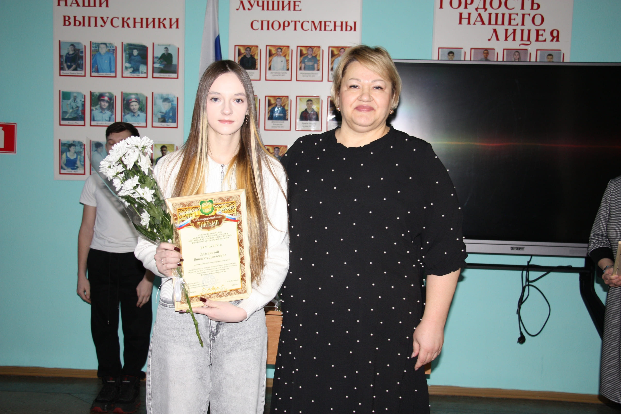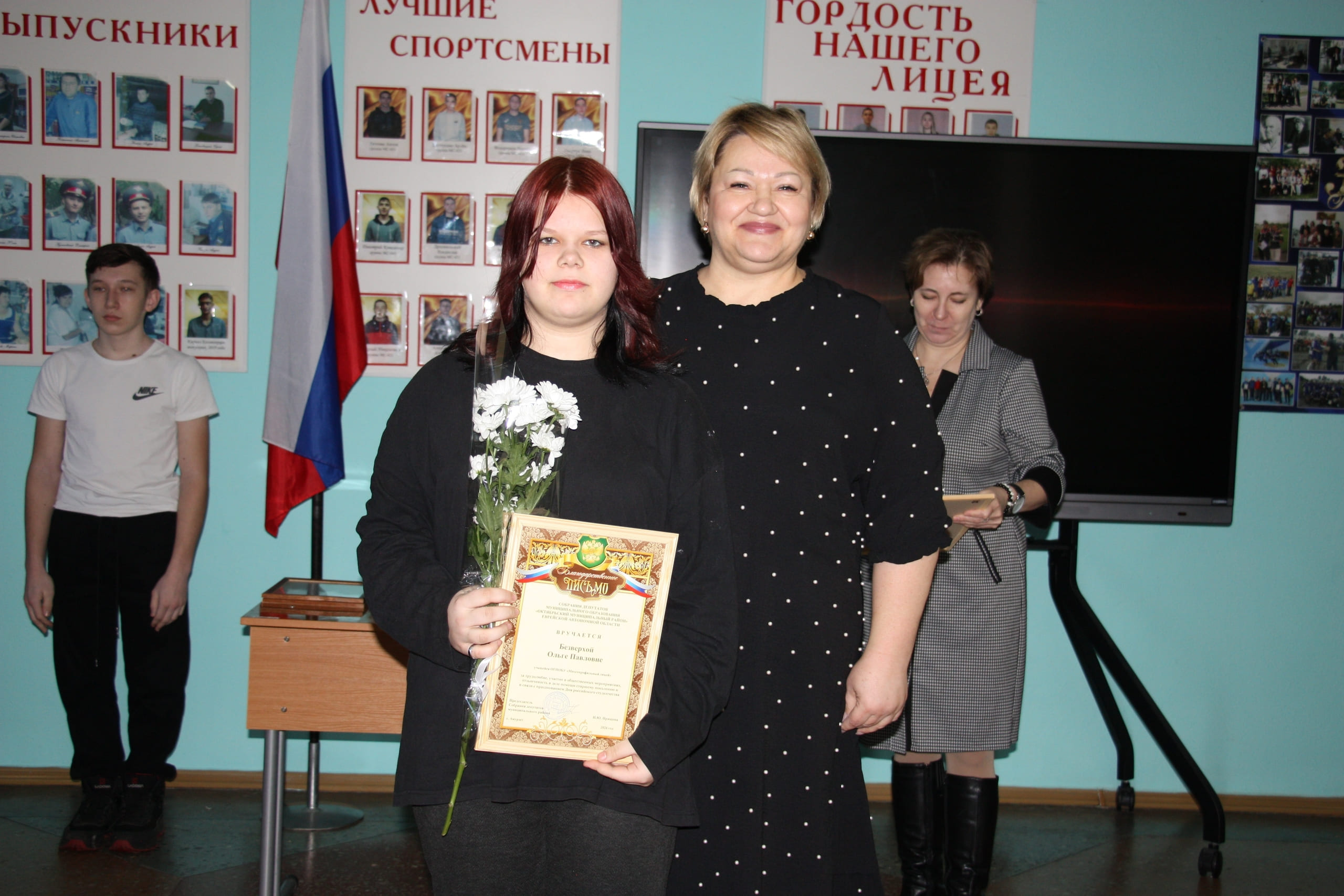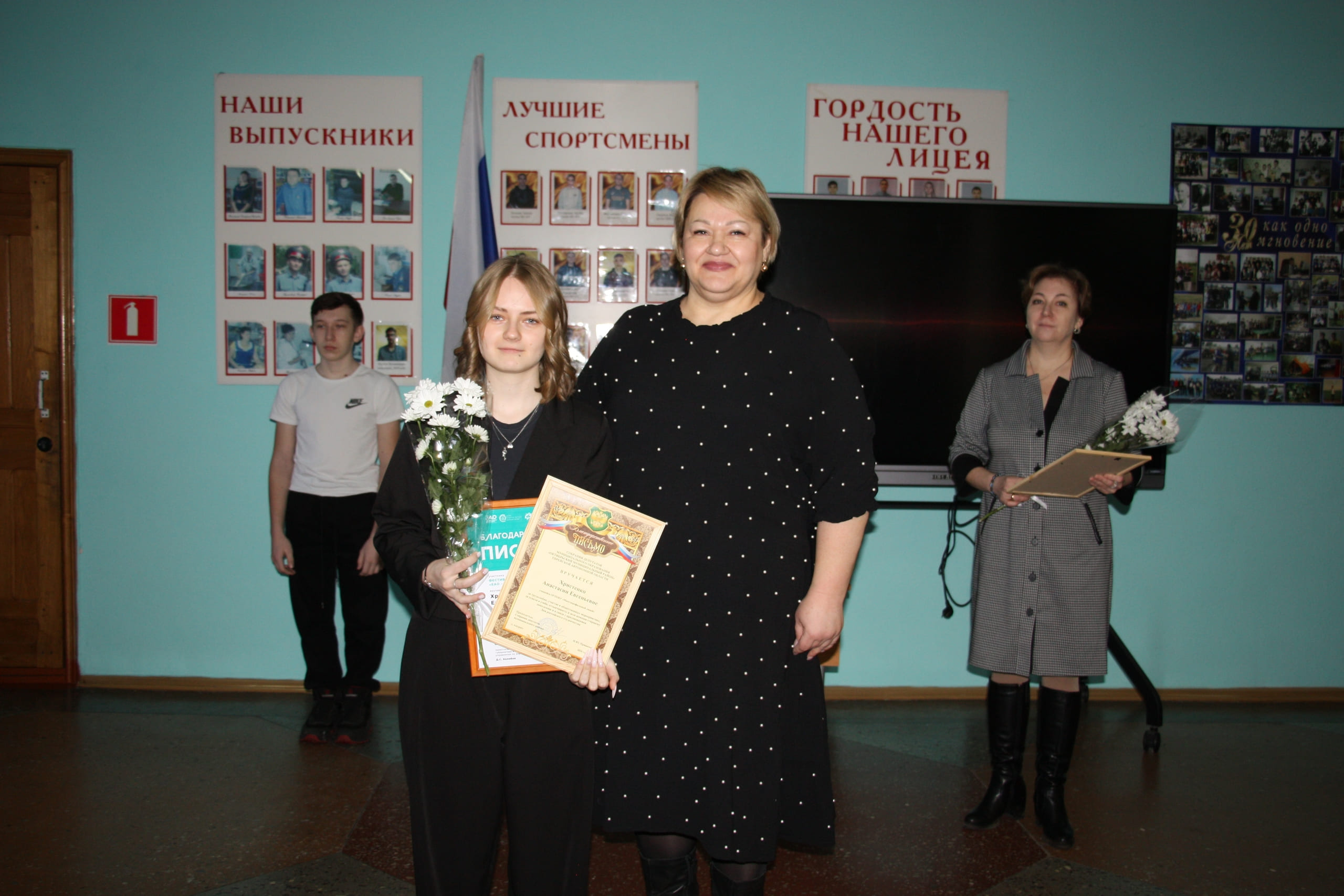 Благодарственными письмами Собрания депутатов муниципального района за трудолюбие, общественную активность, успехи в учебе и отзывчивость в помощи старшему поколению отмечены: Ольга Безверхая, Виолетта Долганова, Анастасия Христенко, Надежда Кучина.
