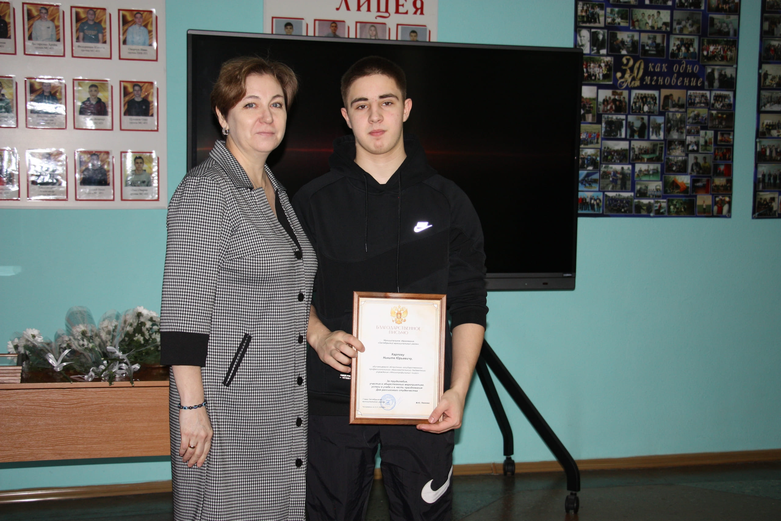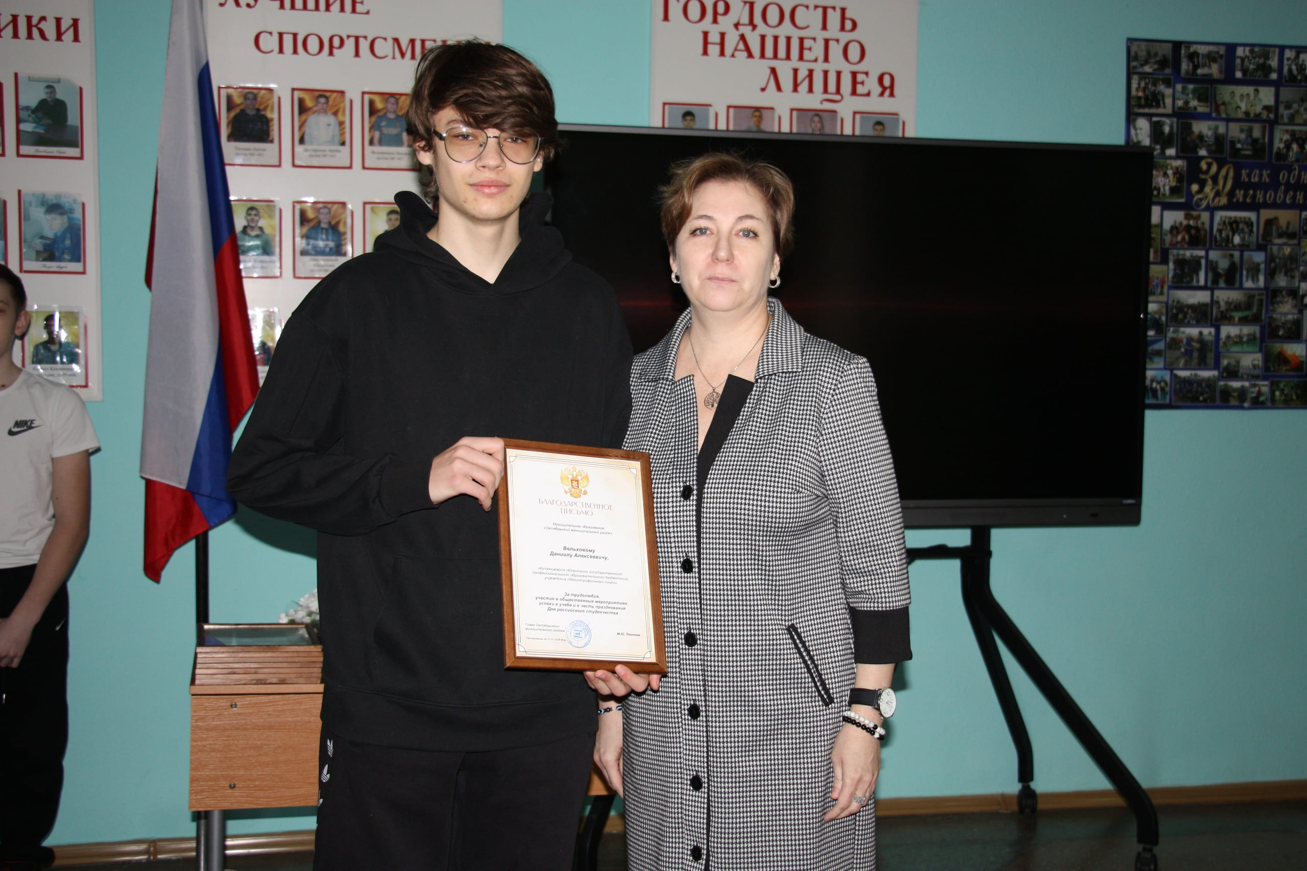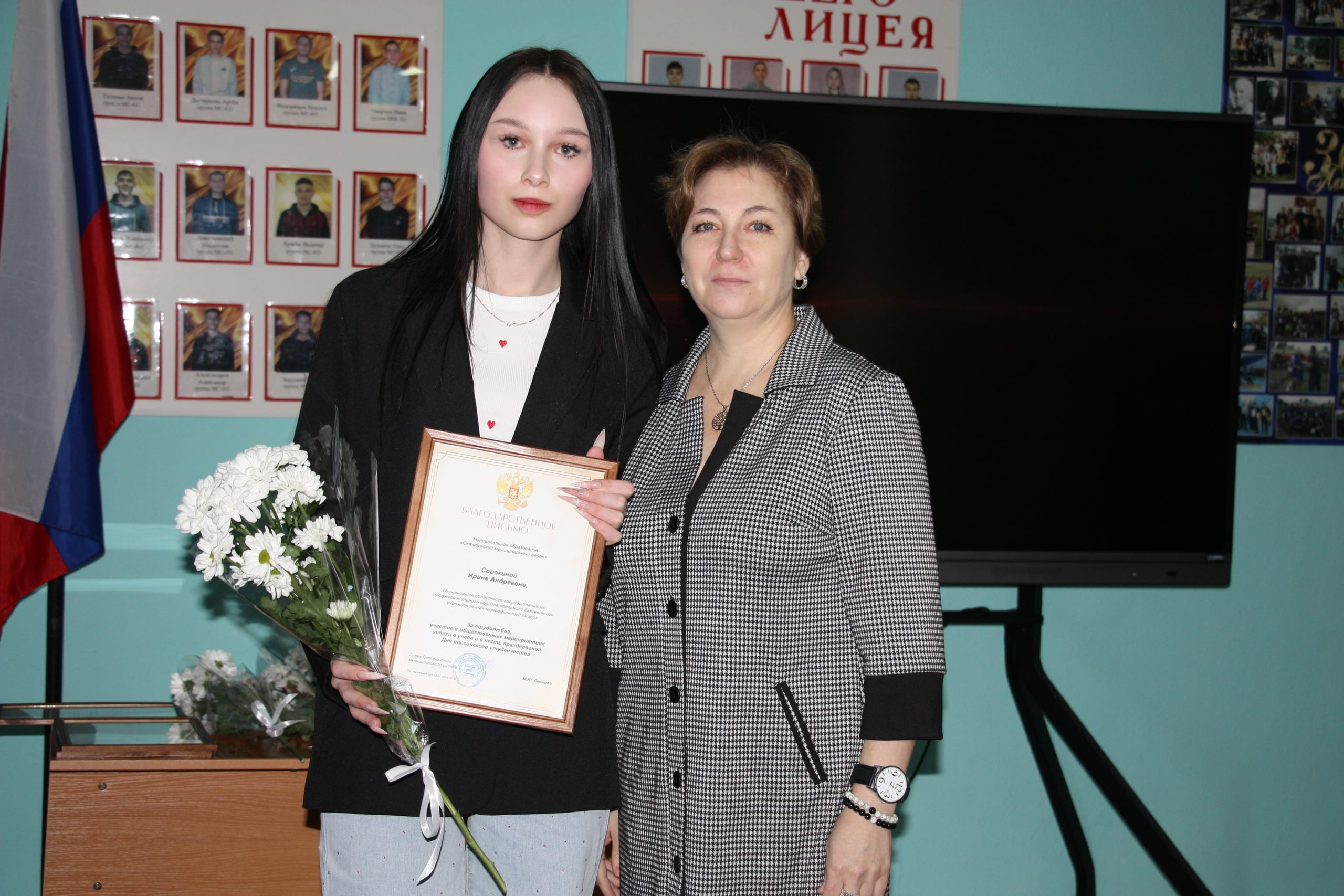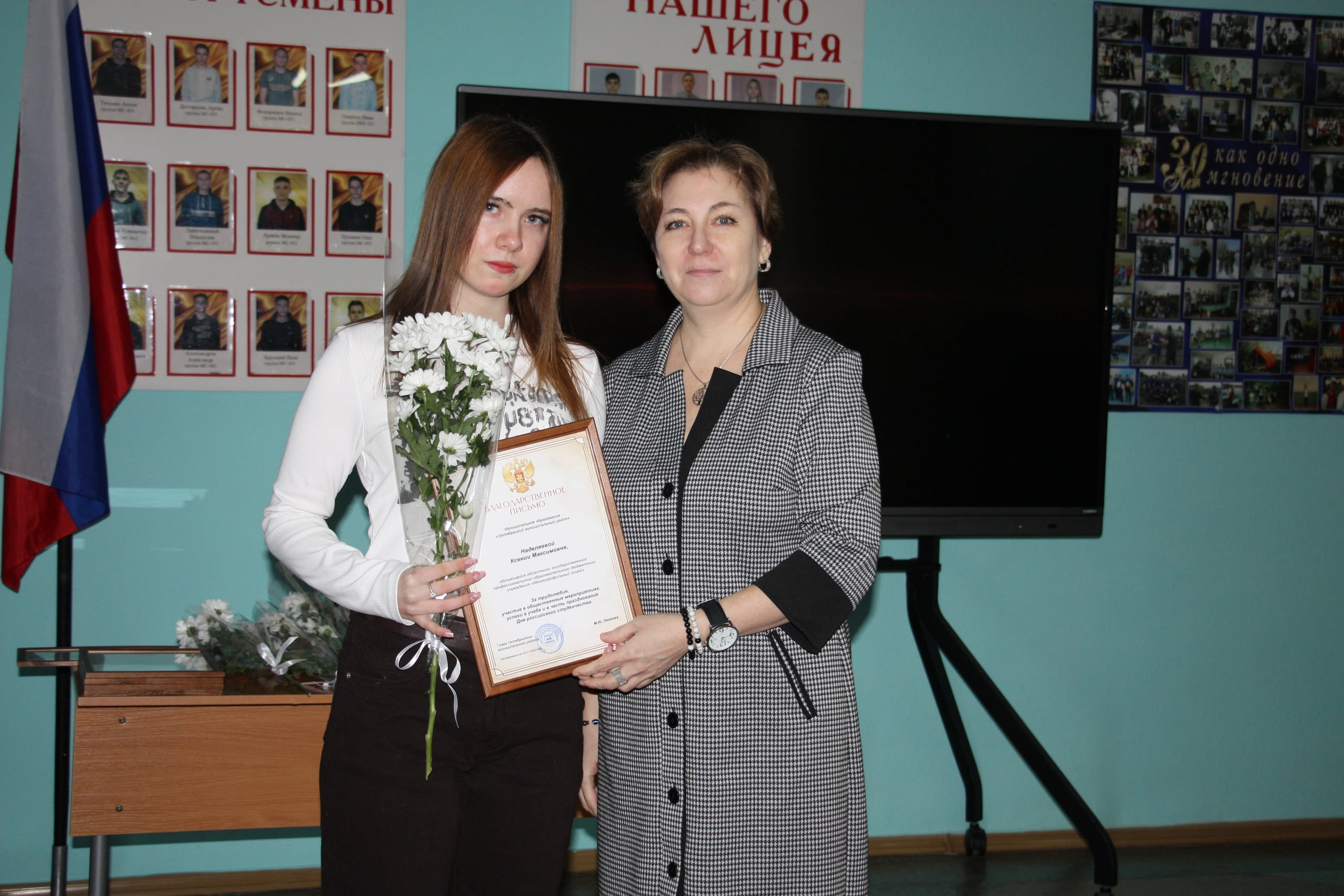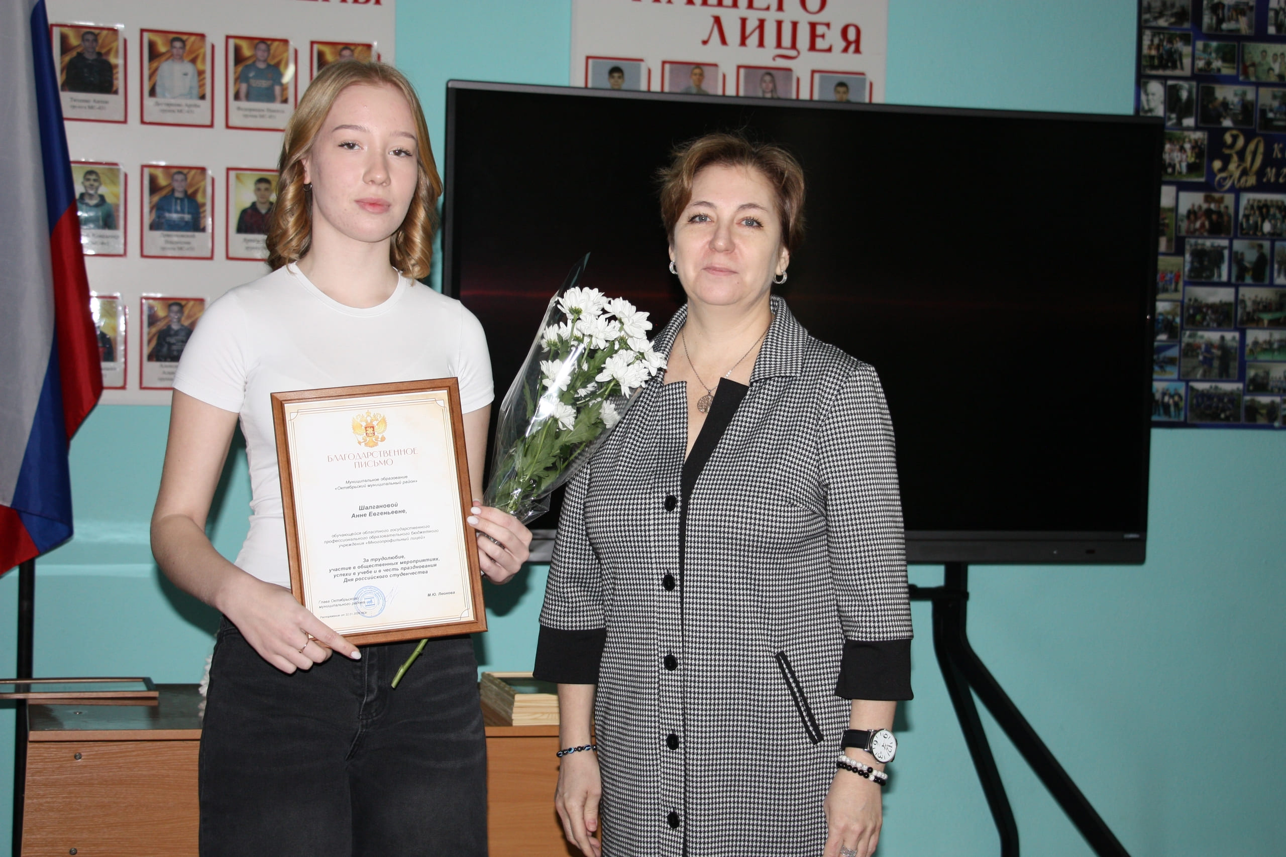 Благодарственными письмами Собрания депутатов муниципального района за трудолюбие, общественную активность, успехи в учебе и отзывчивость в помощи старшему поколению отмечены: Ольга Безверхая, Виолетта Долганова, Анастасия Христенко, Надежда Кучина.